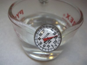 1) Water. Heat 8 oz of water to near boiling- specifically 195-200 degrees.  This is not “my” rule, it’s the French Press rule!  Use a thermometer to make sure it’s EXACTLY in that range.