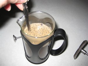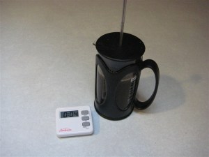 3) Steeping.  Pour the water into the French Press and stir for 10 seconds (careful not to break the glass!), then put the lid on (leave the plunger up) and set a timer for 4 minutes.