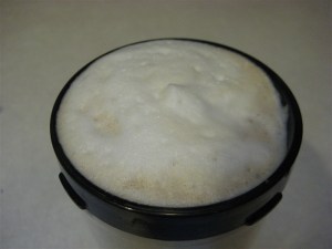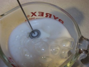 4) Milk. I’ve learned that steamed milk is the key flavor that I enjoy in my lattes and mochas.  I do not have a steamer, nor do I want to heat milk in a saucepan, so I simply microwave 4 ounces of milk for about 1 minute 20 seconds.  The milk should be bubbling when you open the door and have that ‘steamed milk’ aroma. Use a frother to create a nice thick foam.  (I usually pour the hot milk into my mug and froth it there, instead of frothing it first then adding it to the mug.)