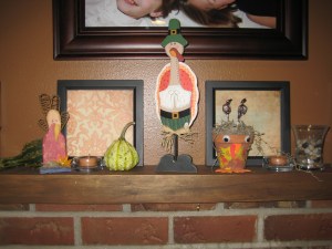 Sunday I had spray-painted some gold frames I bought from the dollar store- I painted them black. This morning I chose five autumn printed papers to put in them as a backdrop to my Thanksgiving decor on our fireplace mantle. I wanted something that wouldn’t detract from what was already up there, something fairly muted, but artsy in itself.