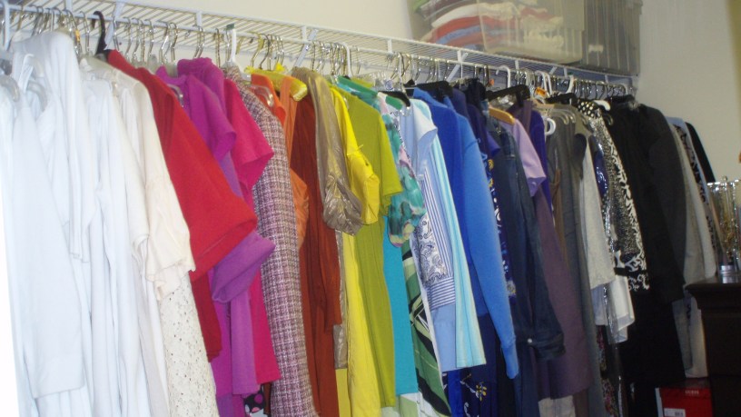 My closet is simple…I have three rods and a shelving unit. One rod has all my dress clothes, jackets and accessories. Another rod hangs my pants and hoodies and ‘cozy’ wear. And my third rod hangs all of my shirts. I try to keep it fairly organized, with all my short-sleeves together and all my long-sleeves together….but that’s about as far as I go.