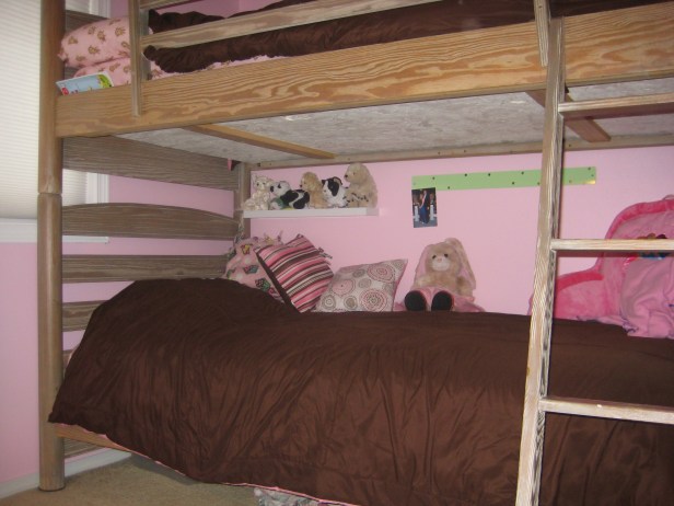 I also gave each girl a shelf above their bed to keep their small stuffed animals (it’s only a 4″ deep shelf) and a magnet strip to hang pictures or other things that are personal to them.