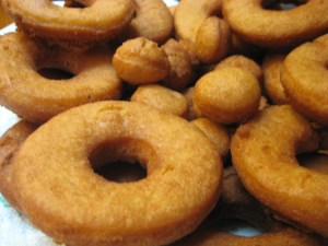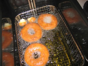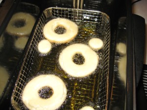 I had them all look at the flattened circles of dough….then they watched me drop them into the hot oil…..and the kids scattered off to play (because I wouldn’t let them climb up on the counter to peer into the vat of 375-degree oil). Safety is key!
