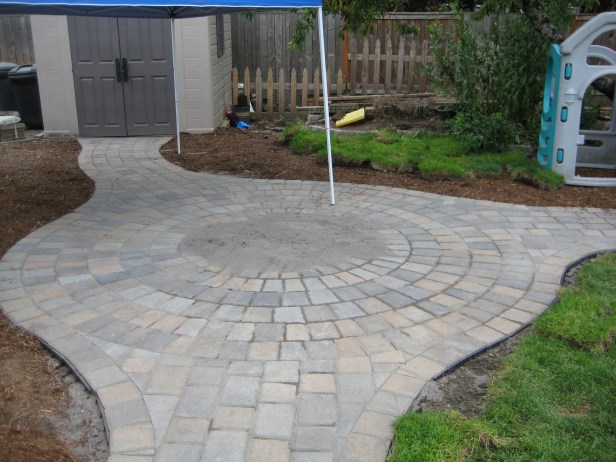 We weren’t home to supervise the job- we were camping- and Clint knew what we wanted but thought it looked weird and made the decision to do it differently, not realizing how important it was to us to have the flared end points to the paths. But he’s making it right. He came back Sunday evening (as soon as we called him) and started fixing the corners. He came back again on Monday after lunch and as of about 5:30pm Monday night- he’s done! I figured out it took a total of 90 hours, which is about what all the other landscapers estimated. Not bad!