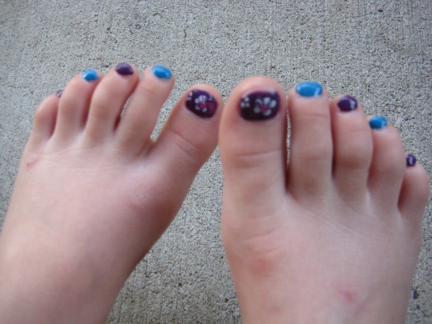 Both girls had a white flower design on their big toenail, with a little “diamond gem” embedded. Brooke chose blue and purple nails, Riley chose pink and turquoise. Unfortunately, Brooke’s nails weren’t completely dry by the time we got in the car, and she bumped her toes and messed up the design. Oh well…