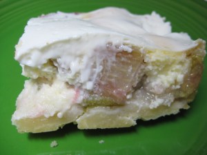 They sounded good, intriguing, relatively easy to make. So I made them. I forgot to finely chop the rhubarb, accidentally leaving it in 1″ chunks. It still turned out OK. I wouldn’t describe it as a cheesecake. It’s more like a layered dessert. I wouldn’t even call it “bars” either.