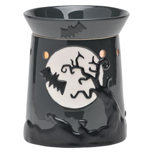 I recently hosted a Scentsy party and had decided before the party that I was going to order their Halloween themed warmer, which is dark gray with a gloss black print of a spooky tree in front of a white moon.
