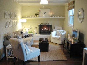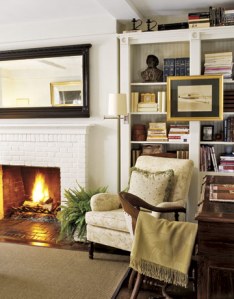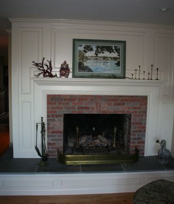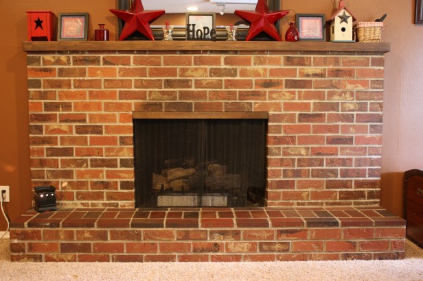 I kind of like this idea- making a wooden mantle to frame the fireplace opening. I don’t think it would quite work the same with ours, but it’s an idea.