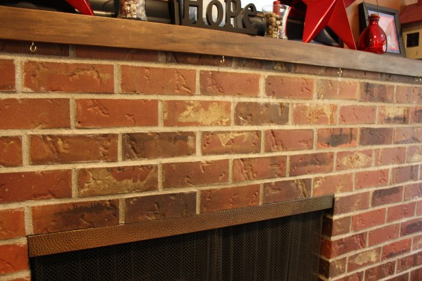 I really dislike our fireplace. For one, it’s so blah. For two, it’s EIGHT FEET WIDE. It is totally the focus of that room. There’s no way around it. But I really LOVE the look of the brick’s themselves- the variety of colors, texture, etc.