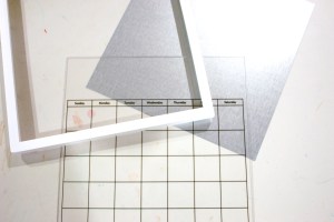Step one: assemble frame. Remove the glass and replace it with the acrylic calendar, then slide a piece of paper behind it, then the magnetic sheet, then put the back of the frame on.