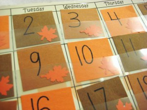 For November I used shades of brown and orange and glued little leaf cutouts onto each square. But I still wasn’t happy. I was using construction paper (which if you are paper crafty like me- you hate construction paper) and my squares were lacking durability and pizzaz. Plus, it’s hard for three-year olds to distingquish between pumpkin, cinnamon and bark shades of brown!
