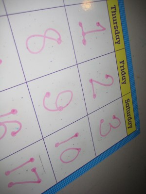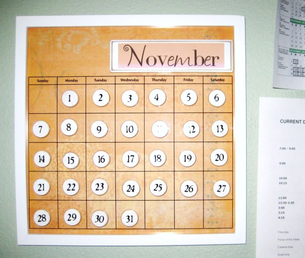 The first calendar I used was a basic dry-erase calendar. Each day I’d write in the date. Sometimes I’d jazz it up by using different colors, or different handwriting styles, but I just wasn’t happy with it. I thought it looked sloppy and unprofessional. Not that the 3 year old kidlets care one way or the other, but “I” care!