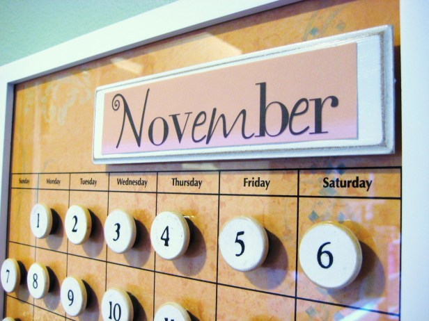 It’s a beautiful calendar display using scrapbooking paper, magnetic backing, a clear dry-erase type surface, and the display in the store had little white-painted wooden disks with the date printed on the front- and magnets on the back, and a wooden plaque for the month….my creative juices start flowing and I can’t control them!