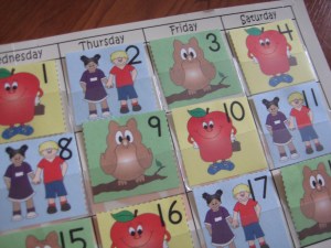 Over the summer I signed up with a different curriculum company and they sent me a nicer looking calendar and each month I could order themed squares with the dates on them. It was kind of cute, really, because it taught patterns and colors in addition to the numbers for the date.