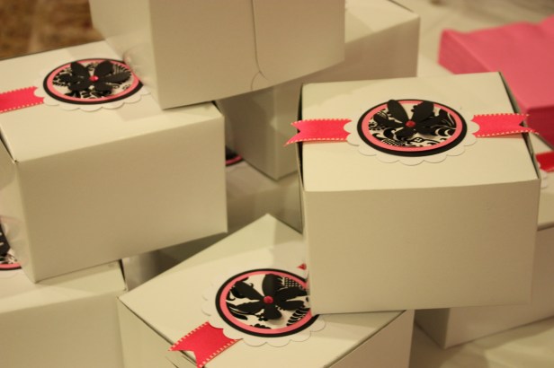 I made inserts to keep the cupcakes from sliding around or tipping over in the box.  I tried using my Cricut to make an insert but it didn’t work out right, so I resorted to drawing out a template and using a large paper cutter to cut the oversized square, my Creative Memories Square Punch to cut the corners out,  a scoring blade on my paper trimmer to score the edges, making folding the sides down much easier, and finally I used my Creative Memories Custom Cutting Circles to make the ‘hole’.  Perfect!