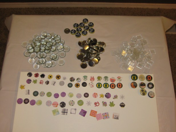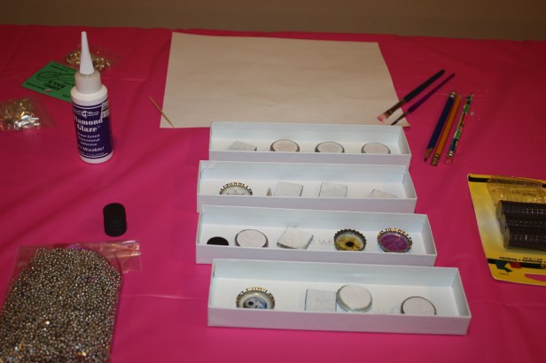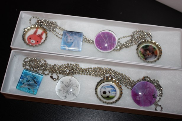 Our first activity is jewelry making.  I had purchased 1″ square glass tiles, round glass drops, and unused (craft) bottle caps.  I also ordered some bails and ball-chain necklaces online.