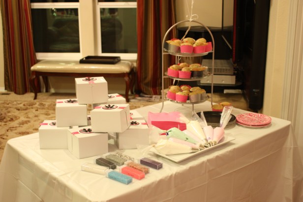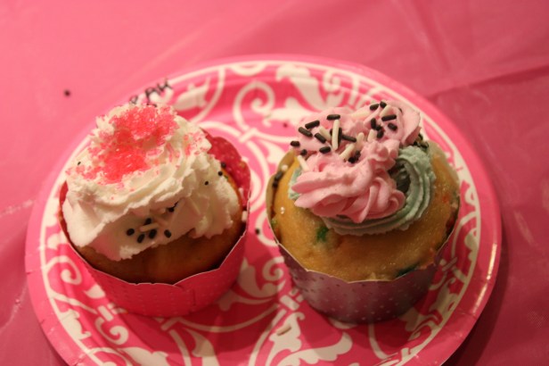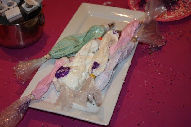 Each girl could choose two cupcaktes- one to decorate and take home (and give to someone or eat themselves, or whatever….) and one to eat.   I baked two boxes of cake mix (using my Demarle Straight Muffin pan which makes cupcakes bigger than standard size) and I made a double-batch of buttercream frosting (using the recipe in the Wilton Cake Decorating handbook).  My sister stopped at the store on here way over and bought a box of clear frosting bags- I was completely out (oops)!  I had just enough “star” tips and couplers to fill 2 bags of each color: white, pink, purple and green.  Well, only one bag of green.