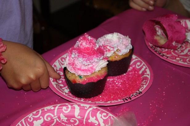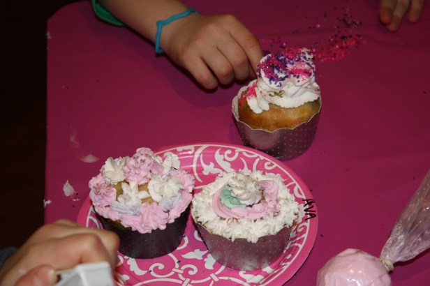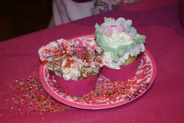 Yes, the girls decorating cupcakes was a very messy project.  The girls went through almost all the sprinkles (most on the floor or table), the double-batch of buttercream frosting (2 pounds of powdered sugar!), and of course I ended up having to sweep half-way through (sprinkles were everywhere) and I had to mop the floors afterwards!