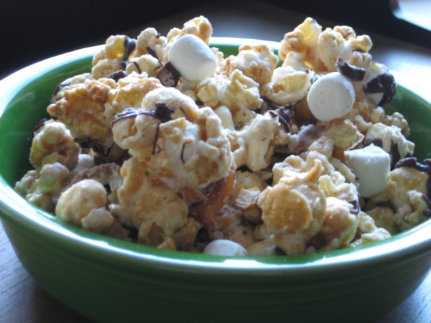 This year I wanted to make a combination of the two. I wanted the popcorn, pretzels, marshmallows, white chocolate and M&M’s, but I also wanted to add Oreo’s and MORE chocolate. And I wanted to jazz it up even more, by making the base with Caramel Corn!