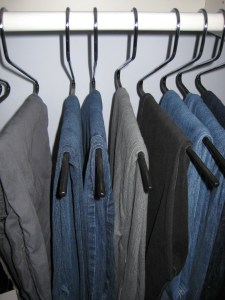 2) Wooden hangers. OK, I’ll admit I have too many shirts to be able to afford wooden hangers for all of them, not only from the space they take up, but also the expense of replacing all those hangers. So I just have the wooden hangers on one side of my closet. The side that I hang my lightweight jackets and sweaters on. It really does make a difference in how that side of the closet “looks”.