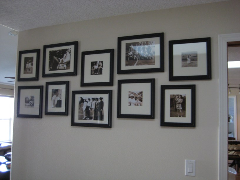 The next step was to buy frames. Or find pictures. Either one would have worked out well as the next step, but as luck would have it, Michael’s was having a sale on a particular brand of frame- any size for $4.00. I loaded up on 3 frames of each of the three sizes. I also picked up 4 smaller desktop frames. I brought them home, then started searching for photographs.