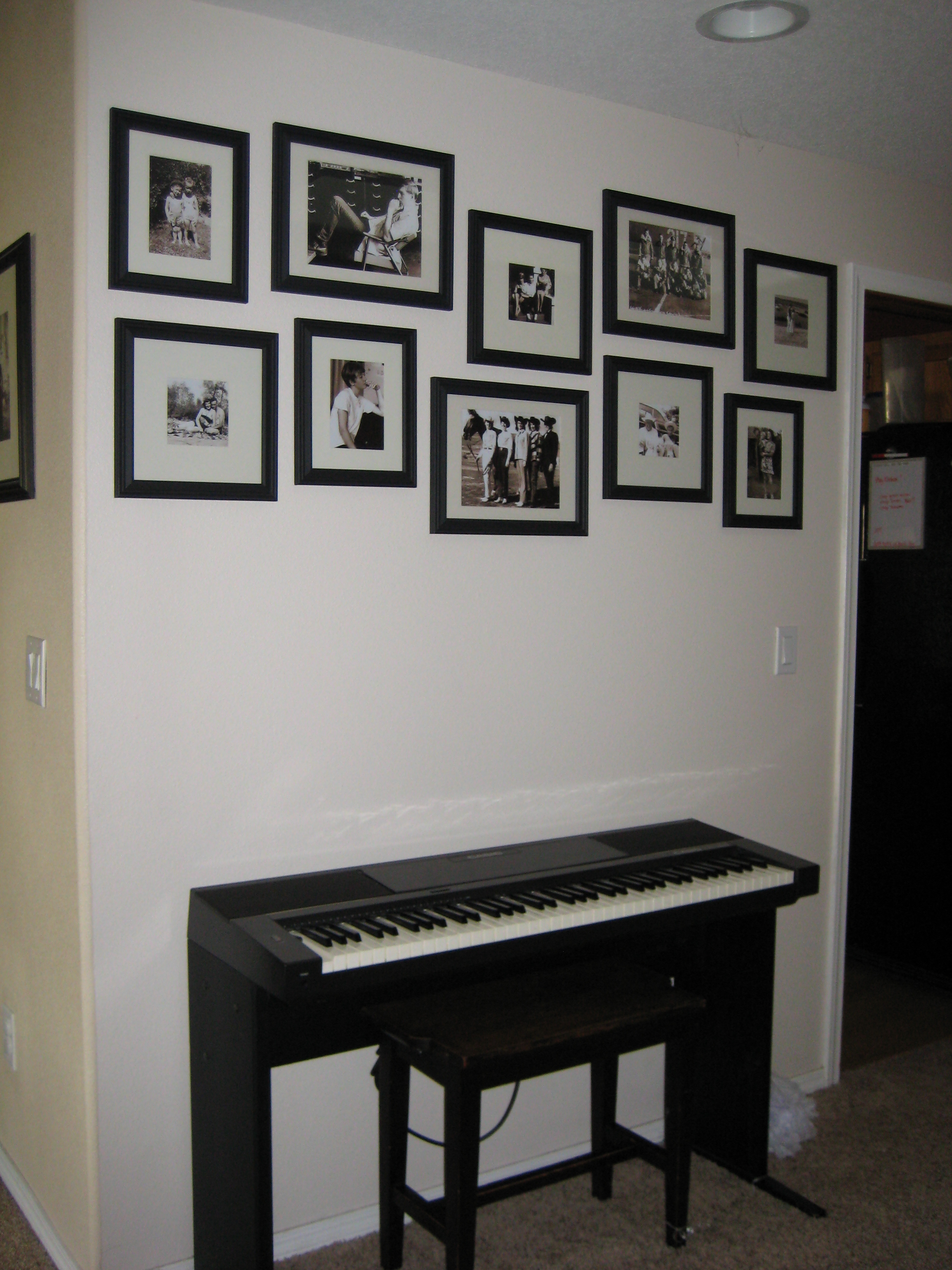 In the midst of this project, after I’d determined my frame collage layout, I was offered a piano. So that meant I had to change the layout so that a 50″ tall piano would fit beneath the “Heritage Wall”. I thought this was a fabulous idea- having a vintage family heirloom beneath our family photos. PERFECT!