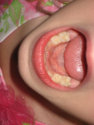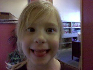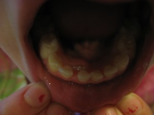 I knew she had one slightly loose tooth, so I wiggled it and it wasn’t any looser than it was a couple weeks ago.  The adjacent tooth didn’t budge at all.  This was on a Friday afternoon and our dentist office was closed (closed Fri-Mon).  I left a message for them to call me on Tuesday.