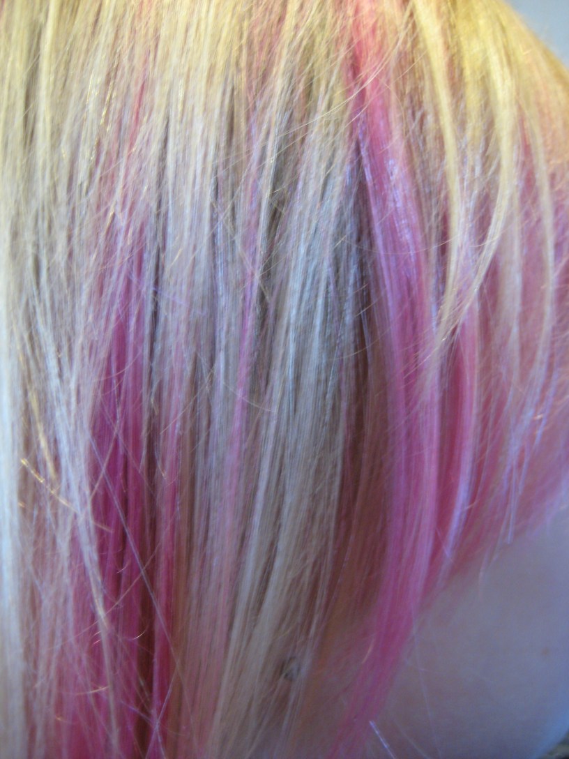After breakfast I colored both girls’ hair. Pink. Yes, PINK. Not wanting to go too crazy or too outrageous I only colored a 3″ long section underneath their part line so that it would be covered but still visible. I originally did this on Thursday night, but it came out too light. I decided I’d apply another coat of the pink color (which is supposed to be temporary but if you heat set it, it is supposed to be more permanent). I heat set it. Both girls ran around with plastic wrap and stocking caps for a couple hours while it set. The result- fantabulous!