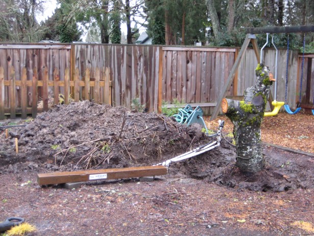 Jim spent more time in the yard that morning. He moved the rest of the retaining wall blocks, dug out the garden sprinkler lines, dug out around the stump some more, cut the roots, and was shocked that the stump won’t even budge after all that. Hmm….seems we’ll need heavy equipment to pull it out. Eek.