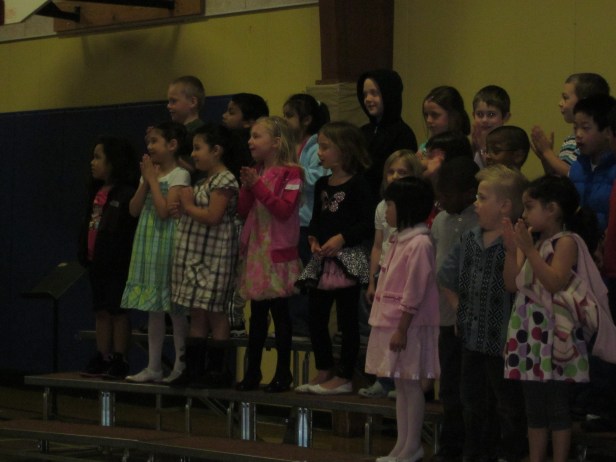 His grade had an end-of-year celebration which included a song that the kids mostly lip-synched to, it was lacking gusto that’s for sure! (I overheard a bunch of the kids saying afterwards that they were lip synching because they didn’t really want to sing it- and several kids just smiled through it and didn’t sing at all!) Much different than Brooke’s Kindergarten music performance.