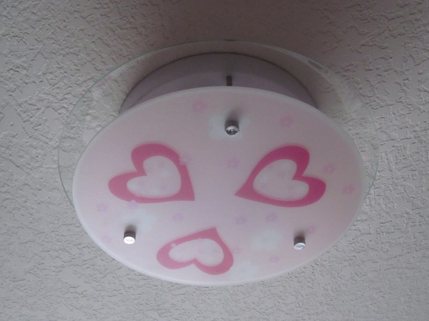 Riley FINALLY got her new light fixture installed. Yes, we are moving that slow around here. We ordered it back in April, and it was finally delivered early June (after being on backorder again and again) and Jim finally found a free hour to install it for her.