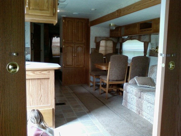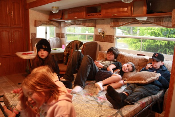 Off topic…..but related…..I just ran across this picture. THIS is why we wanted such a big trailer- so we’d have a place for all the kids to hang out on the really crummy weather days (cuz we camp year round). Yup- here’s SIX kids lounging on the hide-a-bed watching a movie- and there’s still room for more kids (or adults) at the dining table. Or in the back bedroom playing games.