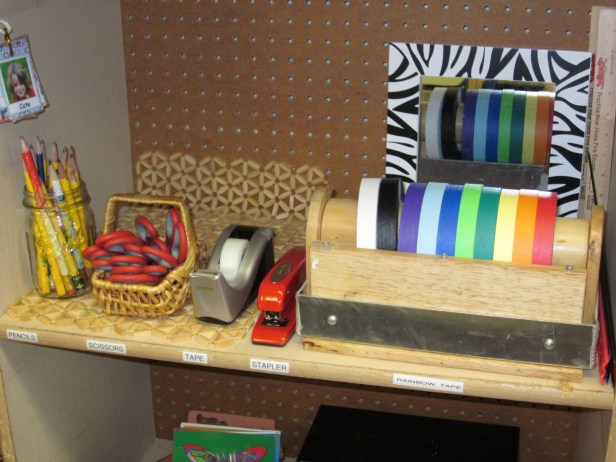 Since she runs a center with 20+ families coming and going throughout the day, she needs a much larger sign-in & communication station. She picked up one of these paper organizer cubbies and told us about how the kids like to write eachother notes and draw pictures and this way the kids can deliver the “mail” to their friends’ boxes. It’s also a great way for the kids to store their artwork to take home.