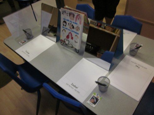 Creating self portraits! I like that she supplies them with a sheet of paper with their name printed on it, a mirror, a small photograph of the kiddo and a pen. Have at it!
