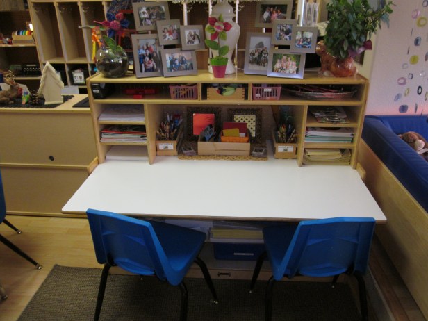 She has an amazing “Studio” area. Basically a small table surrounded by arts & crafts paraphernalia. I particularly like how she has an art project set up and ready to go first thing in the morning for the kiddos as they arrive:
