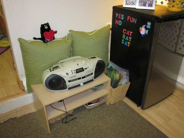 Something else that she had that I thought was great- a Listening Station. Headphones that they can put on to listen to storybooks or music. She said it made a great escape for those kids wanting a little peace and quiet and time away from the other kids. And sometimes the kids listening to music would start dancing and having fun with it. I noticed a bin for audio books (read along type) which were also from the library. Great idea!