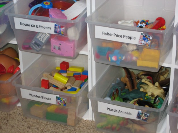 All of our toys are kept in identical clear bins which kind of ‘fade away’ in the grand scheme of things and don’t look as cluttered to me as many other storage options. I like them because it’s easy to see the contents and easy to reach in and grab the contents without pulling out the bin and dumping it out.