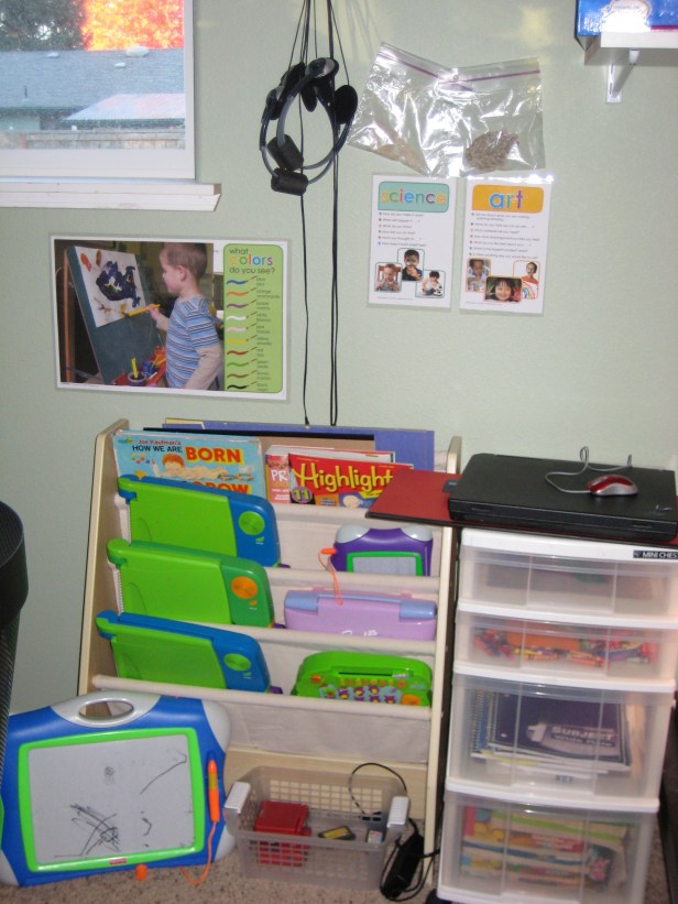 We still have the book slings and book bins, but it’s not as “inviting” like the reading corner was. I’m going to have to find a new cozy chair and reinstate that reading corner! I used to make the area a little more ‘fun’ with a canopy draped over the chair for the kids to go inside to read. But they kept pulling on it, or wiping their noses on it (ewwww).