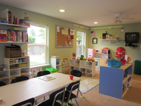 Along with color and texture- specifically regarding toy storage….is reducing clutter. The childcare home that we visited was simply amazing. Her childcare fills up an oversized double-car garage plus a dining room and they added on 2 more rooms plus a bathroom alongside the house for additional space (now it’s a multi-room childcare home with multiple staff to manage each room). Plus she has 12-foot tall ceilings.