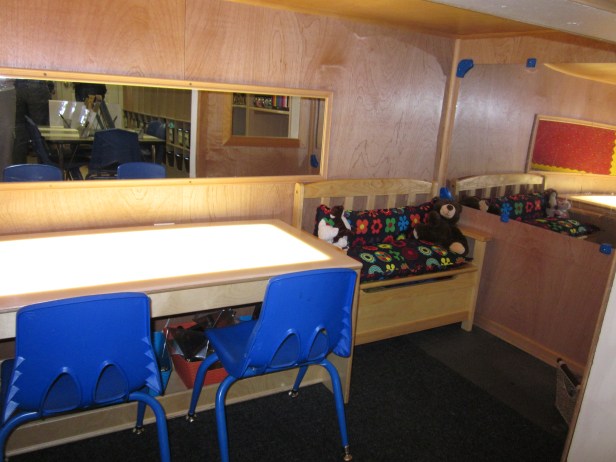 Steps to go up to the top level where it’s designed as a quiet space for 1-3 kiddos to sit or lay down and cuddle with a stuffed animal or just hang out. The lower level has a light table and chairs and mirrors- what a fun idea!