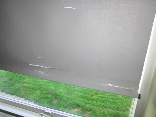 Yes, they have been patched with packing tape. Geez, they’ve been used for the past 4 years on a daily basis going up in the morning, down at quiet time, up after quiet time, down at night…so that’s about 2,928 windings/unwindings. They are worn, they are torn, they’ve been taped, but the mechanics are still working perfectly- and I think I only paid about $15 per shade!
