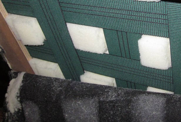Next up I took a thick piece of batting and cut it to size so it would be a layer between the webbing and the new foam, hopefully preventing any break through should our new foam decide to break down after a year like the foam that came with it!