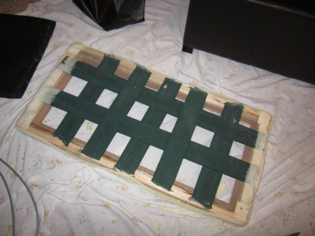 I lay the leather piece face down, inserted the foam, made sure it was square and tight, then I put the batting down, then flipped the web-seat over and started wrapping the edges and stapling (no pics, sorry).