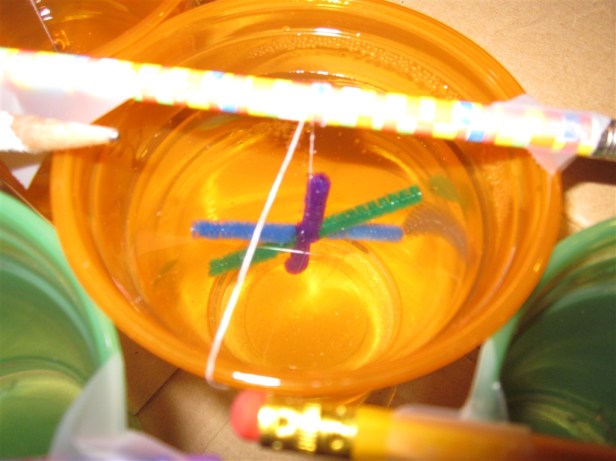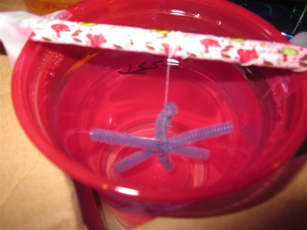 - Hang the pipe cleaner snowflake into the jar so that the pencil rests on top of the jar and the snowflake is completely covered with liquid and hangs freely (not touching the bottom or sides of the jar).