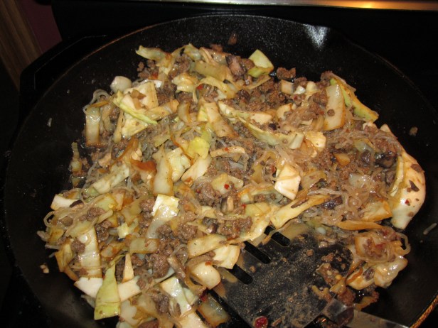 To make a Stir-Fry….. (I like to also add fennel to the above recipe, slicing it thinly and adding it when I add the onion). Once the dish is complete, add a package of rinsed shirataki noodles and mix well. Let it sit overnight in the fridge. The next day, just before serving, saute the cabbage and when it’s still firm add the noodle & meat mixture to the skillet to warm through. YUMMY!