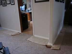 Monday: up at 5:45 with Jim, hanging out on the couch with Jim and the kids until 7am when everyone leaves for school/work. I went outside to water plants, then swept the garage floor, washed the garage entry mat, then Simple Greened the rear and driver side of my Expedition to get all the mildew out of the cracks and seams. It’s now 8am. My mom and Grandma stopped by for a short visit and after they left I went through and washed all the floor moulding, vacuumed the carpet edges, ran masking paper/tape around all the floor edges, and then used wood filler to fill in all the nail holes. What was supposed to be just the hallway has turned into also fixing the living room, family room, entry and pass thru. Geez. By noon I had ran out of tape so I needed to get more and also get a Carl’s Jr burger because I’ve decided I need more calories (I’m back on the 5 & 1 TSFL plan- feeling weak as a result). Back home I finished taping off ALL the trim. That took forever and I didn’t actually start painting until 2:00! Got one coat of paint on ALL the trim….worked until we left for gymnastics at 5:00.
