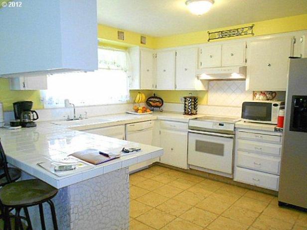 I have to say that despite the fact that the cabinets were painted and not replaced (and currently do not close completely) and the counter top was tiled over (and some tiles are broken), and they left the holes in the cabinets from the knobs (and just replaced the knobs)- I’m glad they’ve made these updates to the kitchen….it suits today’s market. Whew! Back in the day, the kitchen was quite nice- it was updated to blue counters, cream tile backsplash, new linoleum, it looked really good at the time.