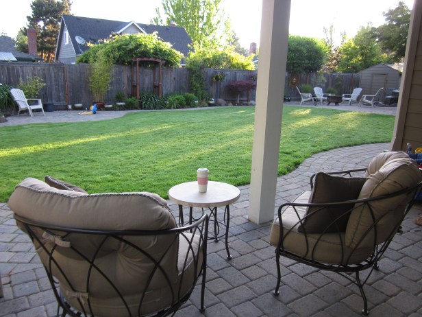 So Sunday morning, we sat on the new Cuddle Set and admired the sun moving overhead, and the view of our yard: