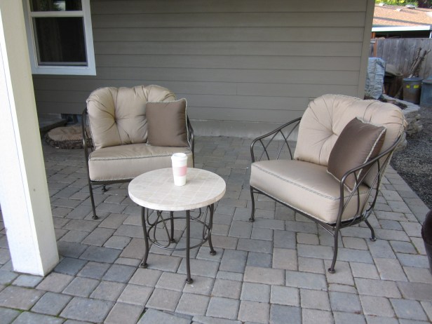 The Cuddle Set will stay under the side patio where it’s protected from the elements, always dry and ready for use.  Maybe if there’s a dry stretch for a lengthy period of time we’ll move it over to the circle patio.  Jim and I enjoy sitting outside on weekend mornings, sipping coffee and planning our day.  We’ve been using our plastic Adirondak chairs for that, which is why we weren’t in a rush to splurge on a Cuddle Set like this, but sometimes when opportunity knocks, you just have to open the door!