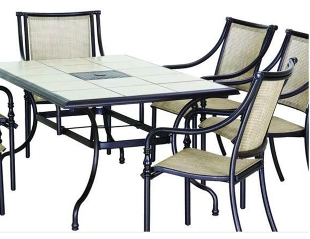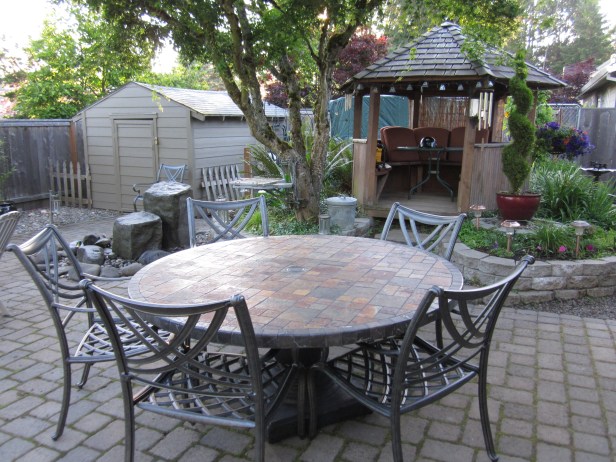 It’s a HEAVY table with sturdy chairs, which is why we felt it was a better value.  It has a slate tile top which coordinates perfectly with our backyard, and the burnt orange chair pads look great, too!
